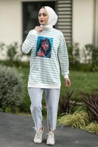 Modalamelif Bisiklet Yaka Çizgi Desenli Girl Baskılı Sweat Pastel Yeşil