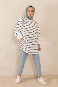 Modalamelif Bisiklet Yaka Çizgili Salaş T-Shirt Beyaz