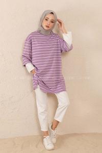 Modalamelif Bisiklet Yaka Çizgili Salaş T-Shirt Lila