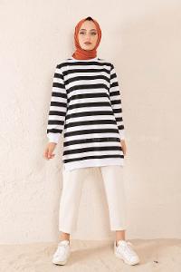 Lamelif Nakışlı Çizgili Sweatshirt Siyah