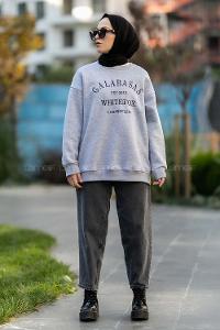 Lamelif Balon Kol Yaka Ve Etek Ucu Manşetli Bol Sweat Gri