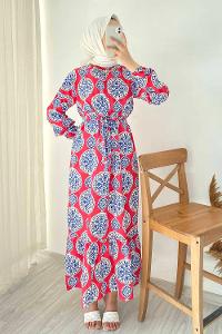 Modalamelif Bisiklet Yaka Kilim Desen Beli Kuşaklı Fırfırlı Elbise Kırmızı