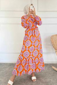 Modalamelif Bisiklet Yaka Kilim Desen Beli Kuşaklı Fırfırlı Elbise Oranj