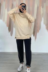 Lamelif Yaka Fermuarlı Crop Triko Kazak Camel