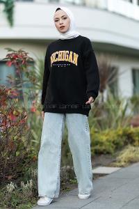 Modalamelif Bisiklet Yaka Mıchıgan Baskılı Sweat Siyah