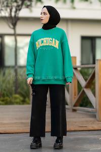Modalamelif Bisiklet Yaka Mıchıgan Baskılı Sweat Zümrüt