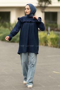 Modalamelif Bisiklet Yaka Önü Fırfır Detaylı Fitlli Tunik Lacivert