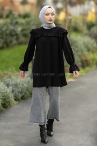 Modalamelif Bisiklet Yaka Önü Fırfır Detaylı Fitlli Tunik Siyah