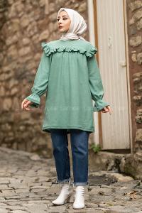 Modalamelif Bisiklet Yaka Önü Fırfır Detaylı Fitlli Tunik Su Yeşili