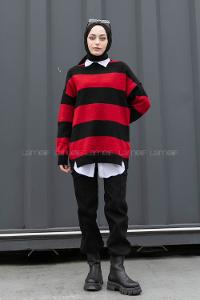 Modalamelif Bisiklet Yaka Renk Garnili Çizgili Bertie Triko Kazak Siyah-Kırmızı