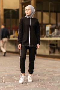 Lamelif Çizgili Pantolon Triko Tesettür Takım Siyah