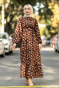 Lamelif Balon Kol Katlı Tesettür Elbise Acı Kahve