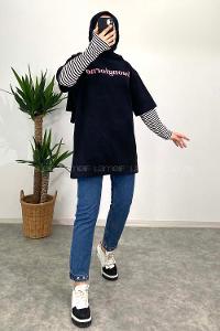 Lamelif Dilvin 30312 Dekoratif Dikişli Bisiklet Yaka Tshirt-Siyah