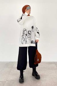 Modalamelif Bisiklet Yakalı Kız Baskılı Sweat Tunik Beyaz