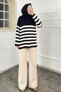 Modalamelif Boğazlı Yarım Fermuar Detaylı Çizgi Desenli Triko Kazak Siyah