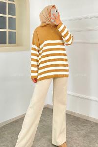 Modalamelif Boğazlı Yarım Fermuar Detaylı Çizgi Desenli Triko Kazak Sütlükahve