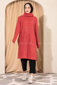 Modalamelif Boğazlı Yırtmaç Detaylı Salaş Triko Tunik Pembe
