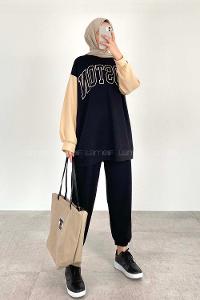 Modalamelif Boston Baskılı Kol Garnili Sweat Siyah