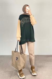 Modalamelif Boston Baskılı Kol Garnili Sweat Yeşil