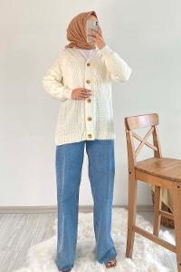 Modalamelif Boydan Düğmeli Örgü Desen Hırka Ekru