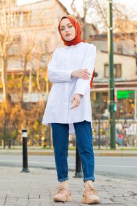 Lamelif Gizli Düğme Detaylı Tesettür Tunik Beyaz