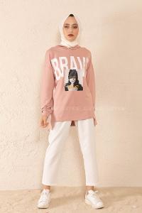 Lamelif Kapşonlu Oversize Yan Cepli Sweat Pudra