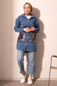 Modalamelif Cep Pul Payetli Uzun Ceket İndigo