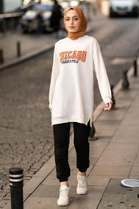 Modalamelif Chıcago Baskılı Yırtmaçlı Kol Lastikili Tunik Beyaz-Oranj