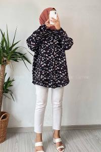 Modalamelif Çiçek Baskı Detaylı Gofre Gömlek Siyah