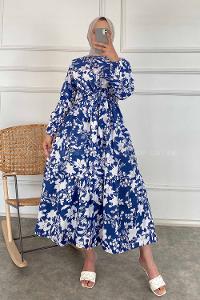 Lamelif Balon Kol Katlı Tesettür Elbise Saks Mavisi