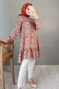 Modalamelif Çiçek Desen Eteği Fırfırlı Tunik Kiremit