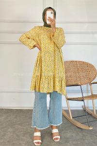 Modalamelif Çiçek Desen Eteği Fırfırlı Tunik Sarı