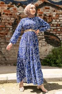 Modalamelif Çiçek Desen Hasır Kemerli Elbise İndigo