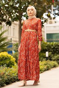 Modalamelif Çiçek Desen Hasır Kemerli Elbise Kiremit