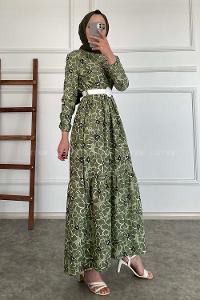 Modalamelif Çiçek Desen Kemerli Pegasus Elbise Çağla