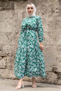 Modalamelif Çiçek Desen Kuşak Bağlamalı Elbise Yeşil