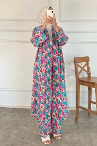 kuşak bağlamalı çiçek desenli cepli ikili takım kimono model tunik