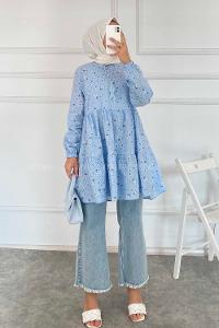 Lamelif Flores Fırfırlı Tunik Saks Mavisi
