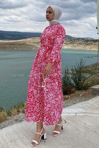 Modalamelif Çiçek Motifli Eteği Fırfırlı Kuşaklı Elbise Kırmızı