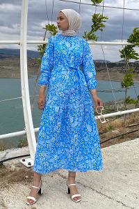 Modalamelif Çiçek Motifli Eteği Fırfırlı Kuşaklı Elbise Mavi