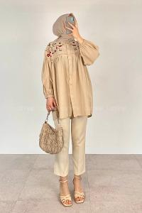 Modalamelif Çiçek Nakışlı Pileli Tunik Bej