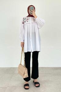 Modalamelif Çiçek Nakışlı Pileli Tunik Beyaz