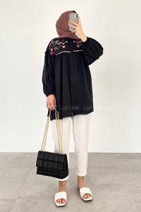 Modalamelif Çiçek Nakışlı Pileli Tunik Siyah