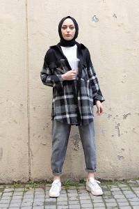 Modalamelif Çif Cepli Ekose Kadife Gömlek Gri