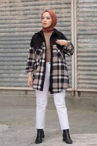 Modalamelif Çif Cepli Ekose Kadife Gömlek Siyah Vizonrengi
