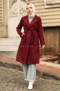 Modalamelif Çift Cep Detaylı Kuşak Bağlamalı Kaşe Kaban Bordo
