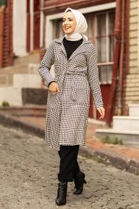 Modalamelif Çift Cep Detaylı Kuşak Bağlamalı Kaşe Kaban Siyah-Beyaz
