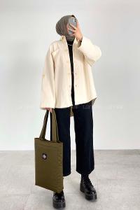 Modalamelif Çift Cepli Asimetrik Kesim Gömlek Krem