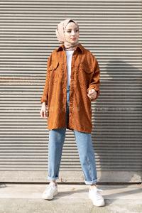 Modalamelif Çift Cepli Kadife Gömlek Taba