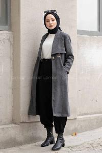 Modalamelif Çift Cepli Kuşaklı Kaşe Kaban Antrasit